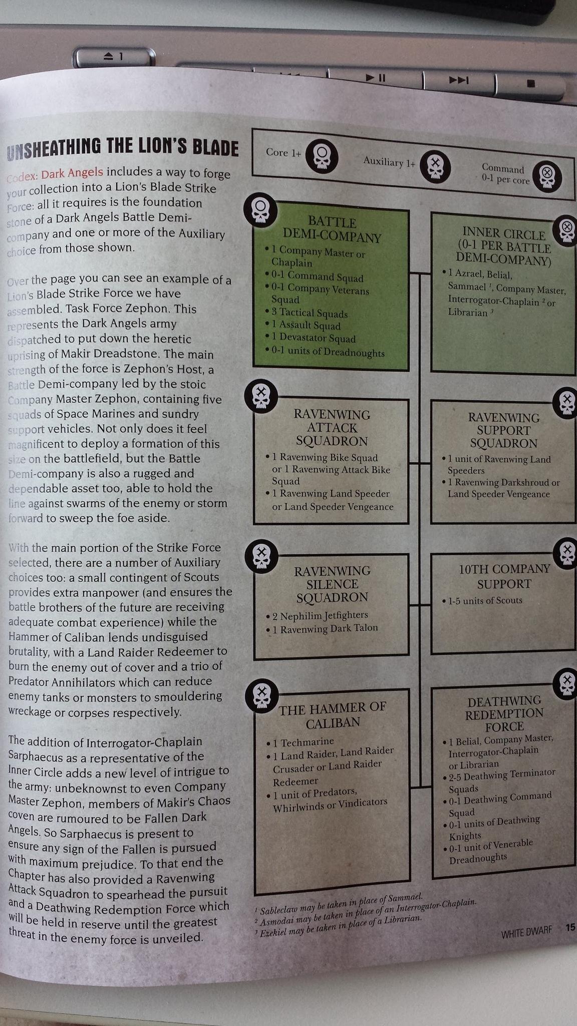Intercepted on the airwaves is this image showing details of formations and detachments from the new Dark Angels codex.